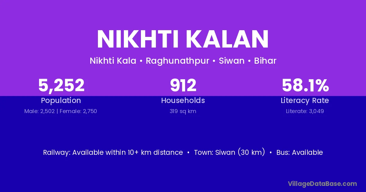 Siwan (30 km) is the nearest town to Nikhti Kalan village for major economic activities and is located approximately 30 km away.