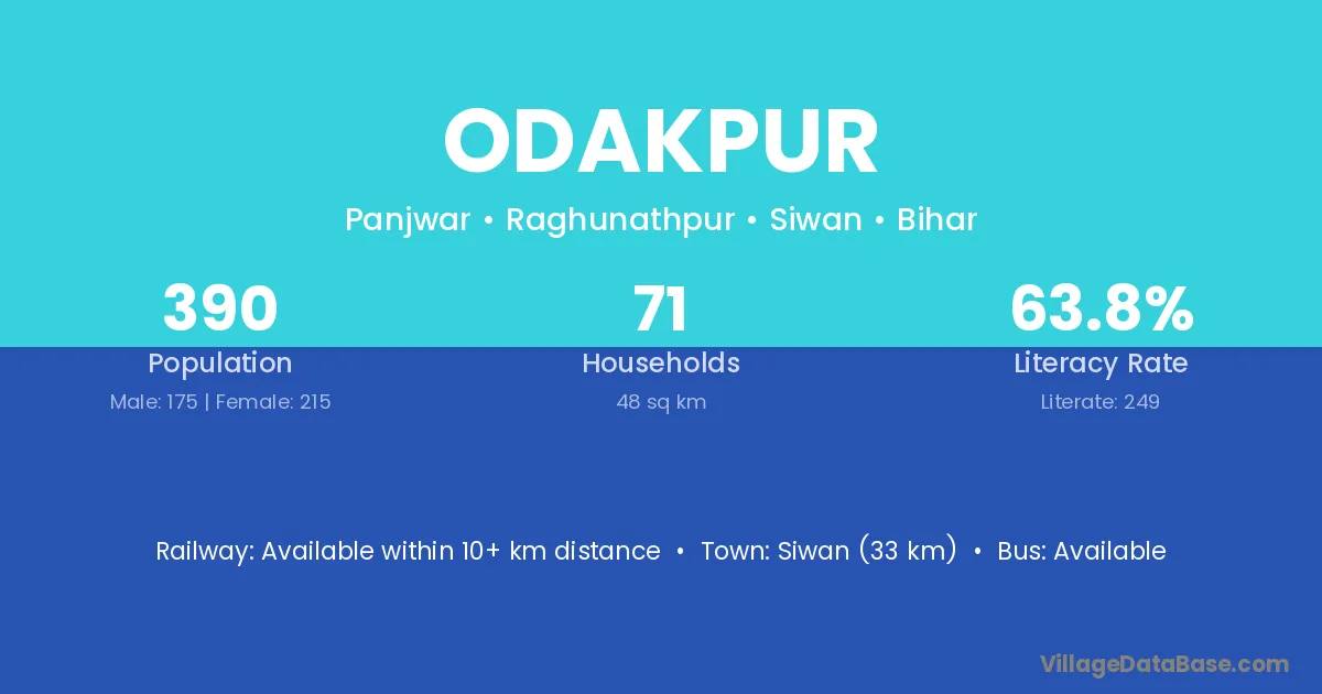 Siwan (33 km) is the nearest town to Odakpur village for major economic activities and is located approximately 33 km away.