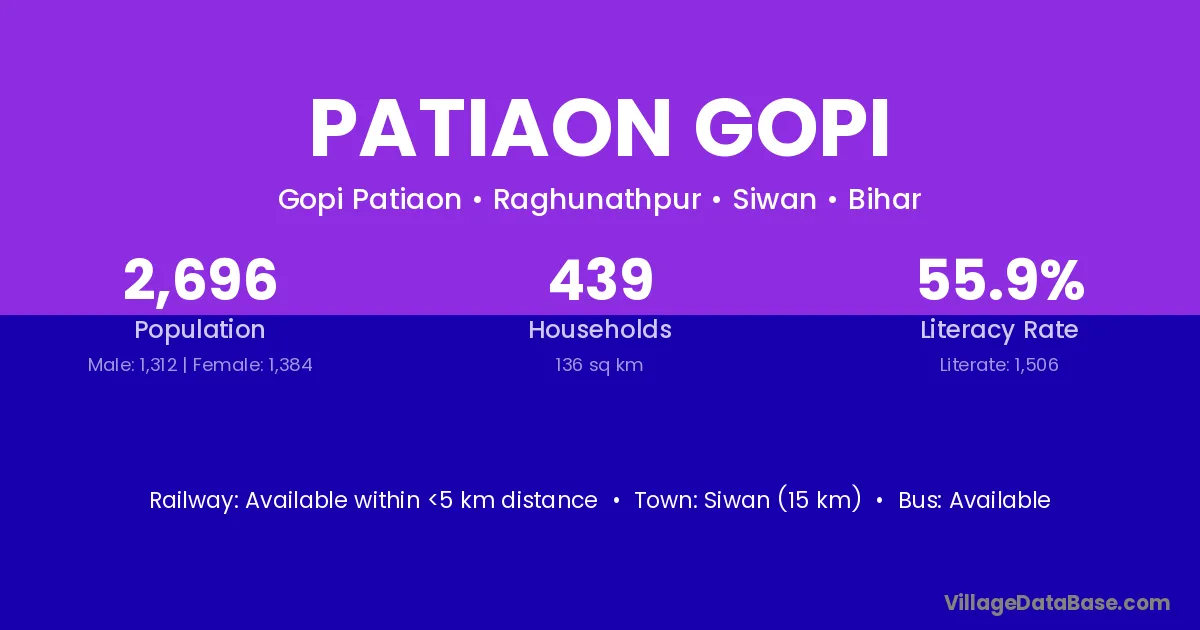 Siwan (15 km) is the nearest town to Patiaon Gopi village for major economic activities and is located approximately 15 km away.