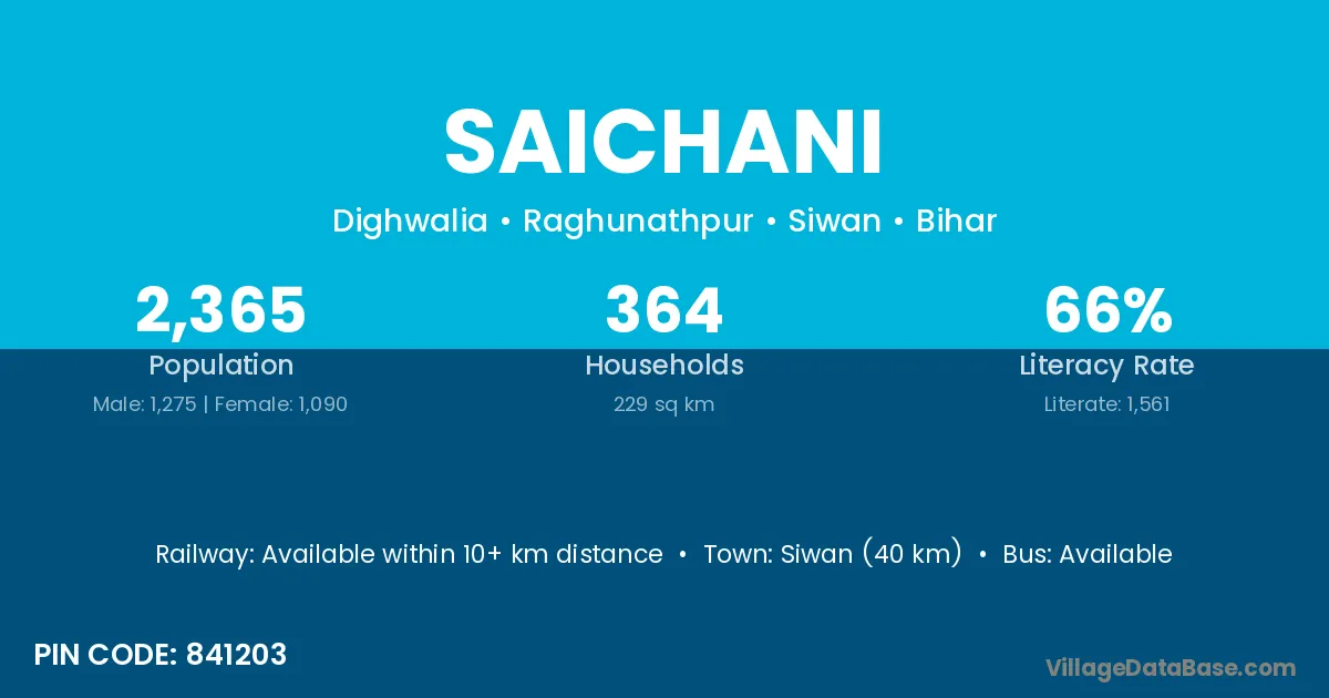 Siwan (40 km) is the nearest town to Saichani village for major economic activities and is located approximately 40 km away.