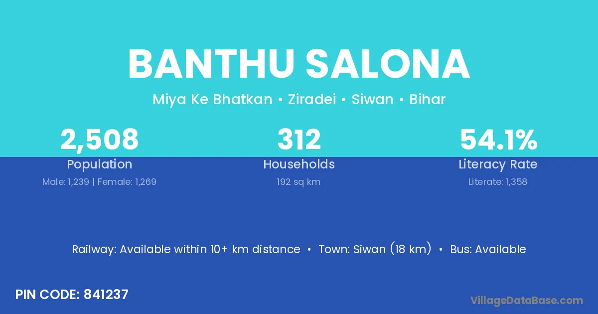 Siwan (18 km) is the nearest town to Banthu Salona village for major economic activities and is located approximately 18 km away.