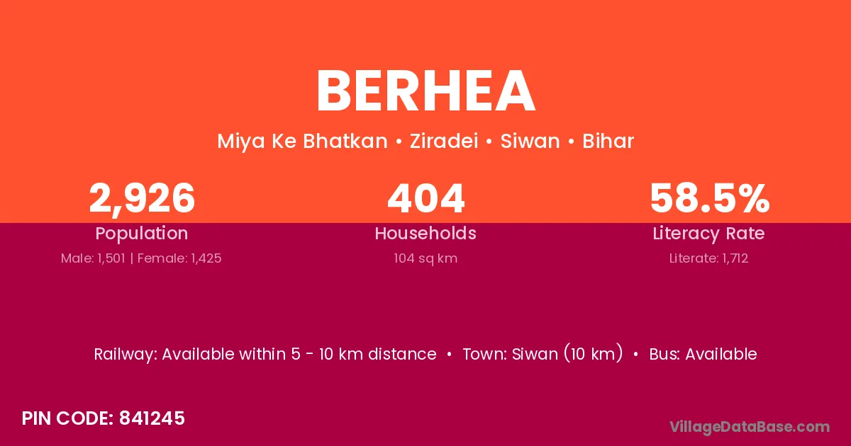 Siwan (10 km) is the nearest town to Berhea village for major economic activities and is located approximately 10 km away.