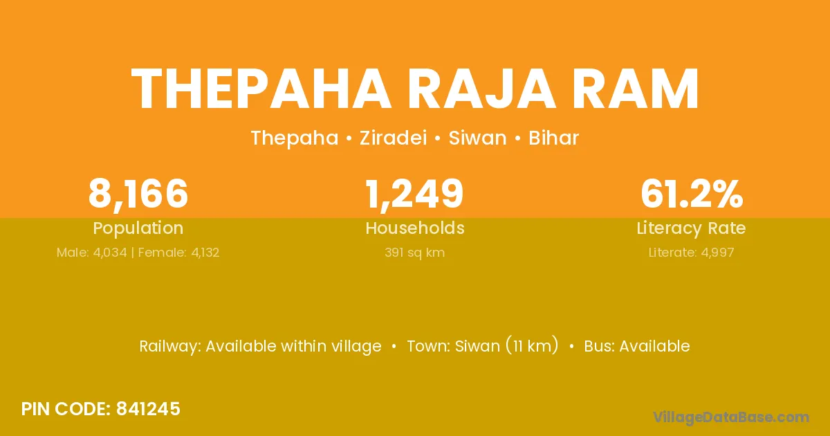 Thepaha Raja Ram village has a total population of 8,166 people, of which 4,034 are males and 4,132 are females.
