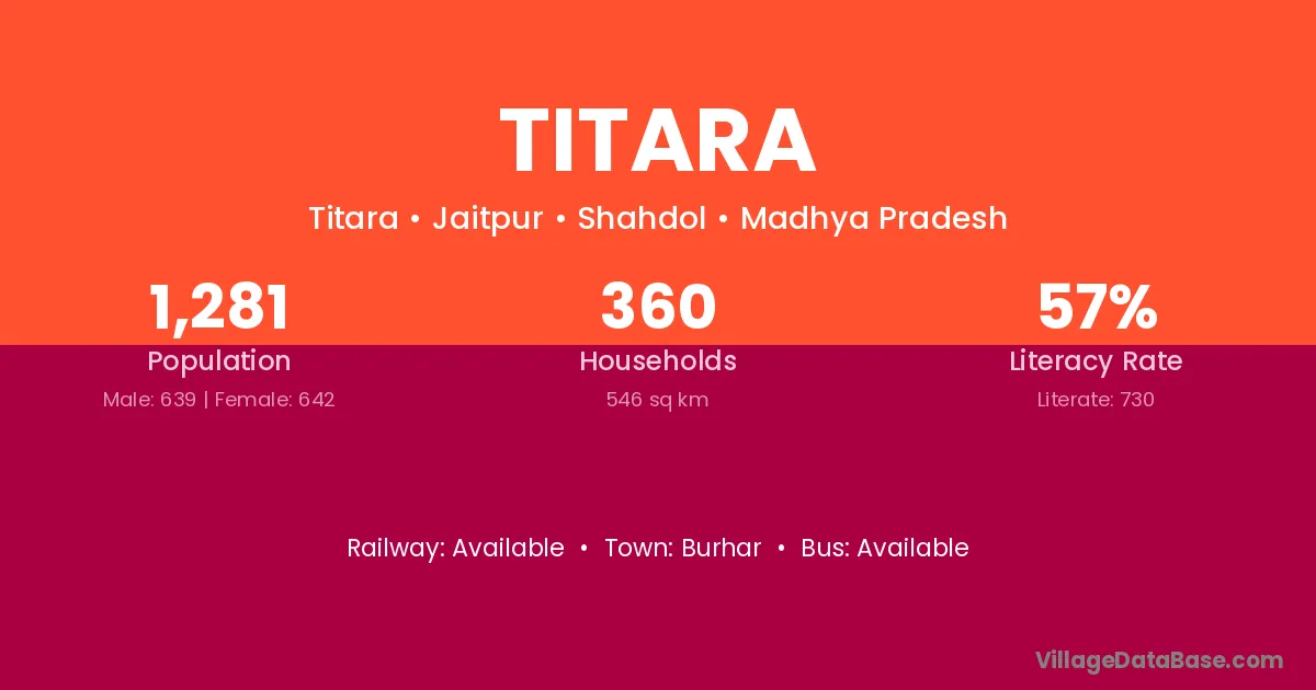 The literacy rate of Titara village is 57.05%. Male literacy stands at 66.85% and female literacy at 47.07%.