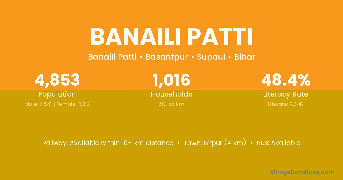 Birpur (4 km) is the nearest town to Banaili Patti village for major economic activities and is located approximately 4 km away.