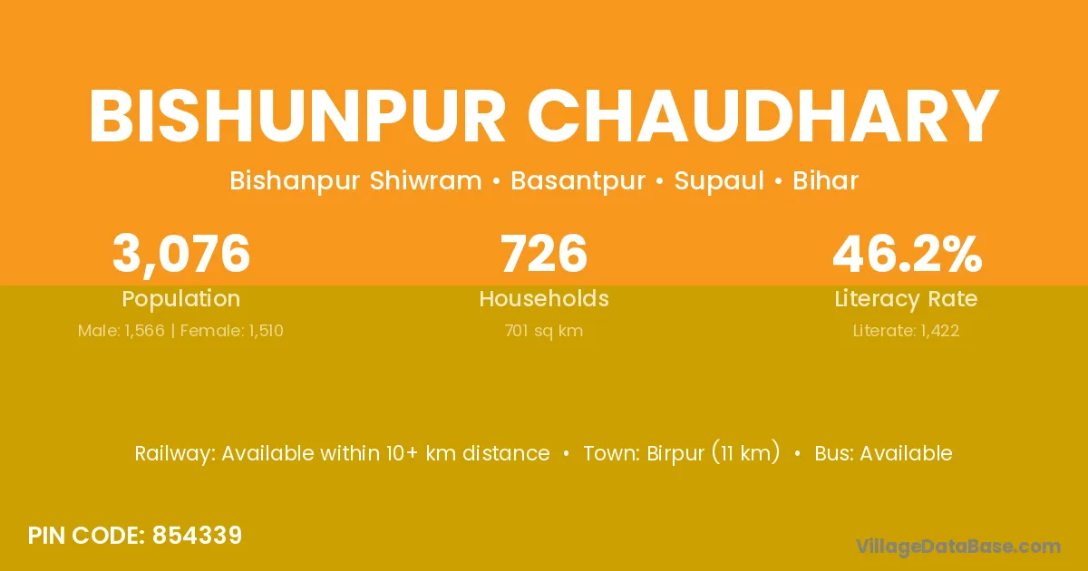 Birpur (11 km) is the nearest town to Bishunpur Chaudhary village for major economic activities and is located approximately 11 km away.