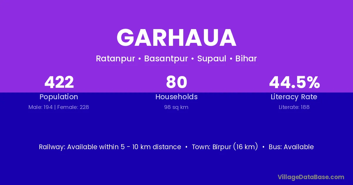 Birpur (16 km) is the nearest town to Garhaua village for major economic activities and is located approximately 16 km away.