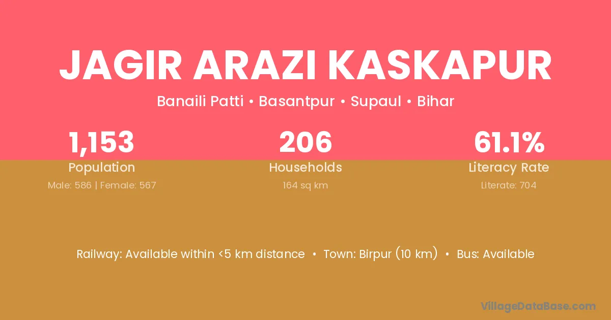 Jagir Arazi Kaskapur village has a total population of 1,153 people, of which 586 are males and 567 are females.