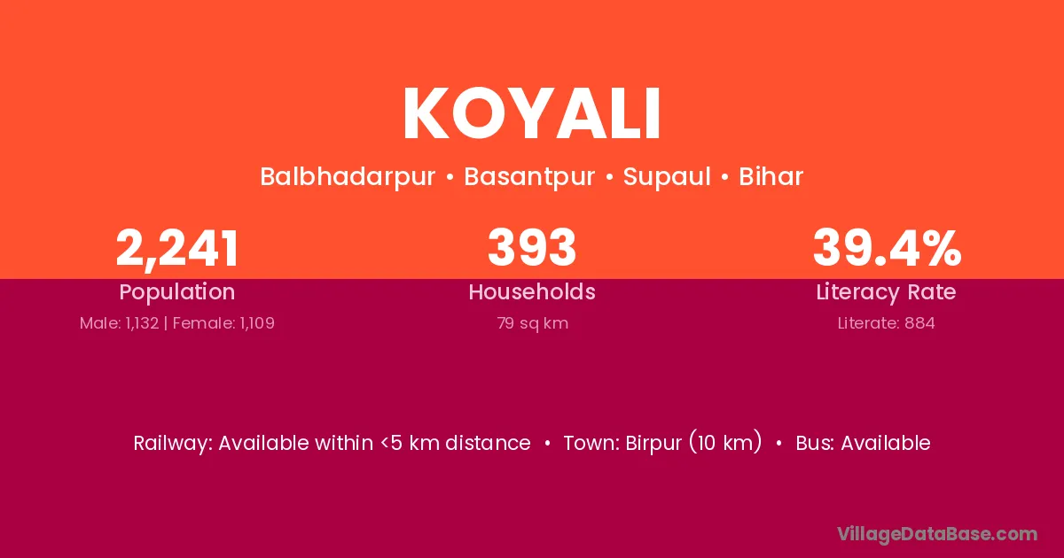 Birpur (10 km) is the nearest town to Koyali village for major economic activities and is located approximately 10 km away.