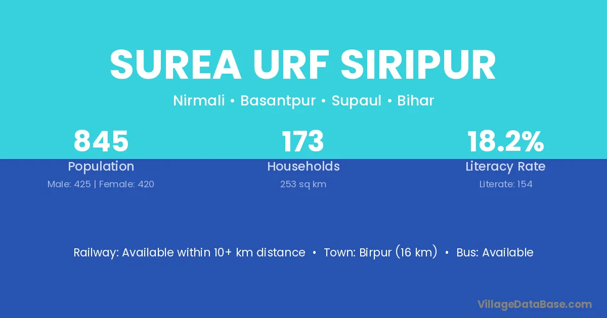 Birpur (16 km) is the nearest town to Surea Urf Siripur village for major economic activities and is located approximately 16 km away.
