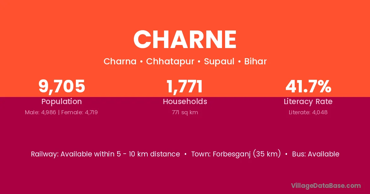 Forbesganj (35 km) is the nearest town to Charne village for major economic activities and is located approximately 35 km away.