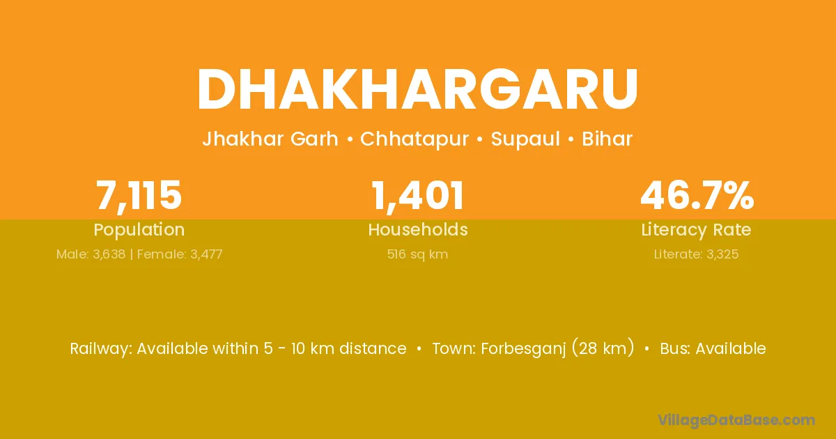 Forbesganj (28 km) is the nearest town to Dhakhargaru village for major economic activities and is located approximately 28 km away.