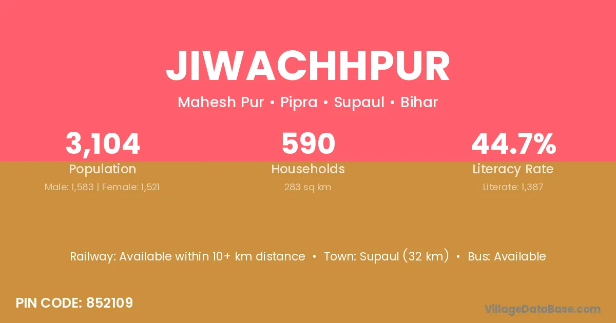Forbesganj (18 km) is the nearest town to Jiwachhpur village for major economic activities and is located approximately 18 km away.