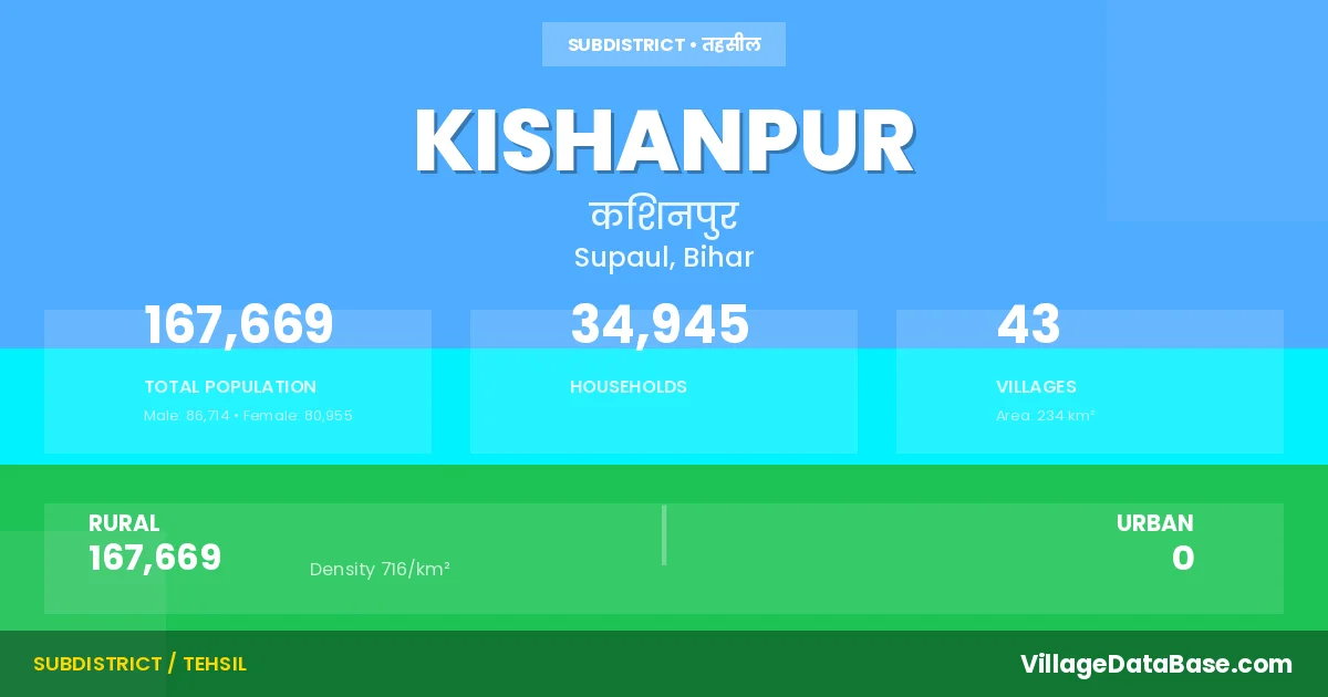 Kishanpur is a town and Subdivision in the Supaul district of the Bihar. In India, a Subdivision is a subdivision of a district responsible for the administration and revenue collection of a specific area within the district. Subdivisions play a crucial role in the local governance structure, contributing significantly to the development and administration of their communities.