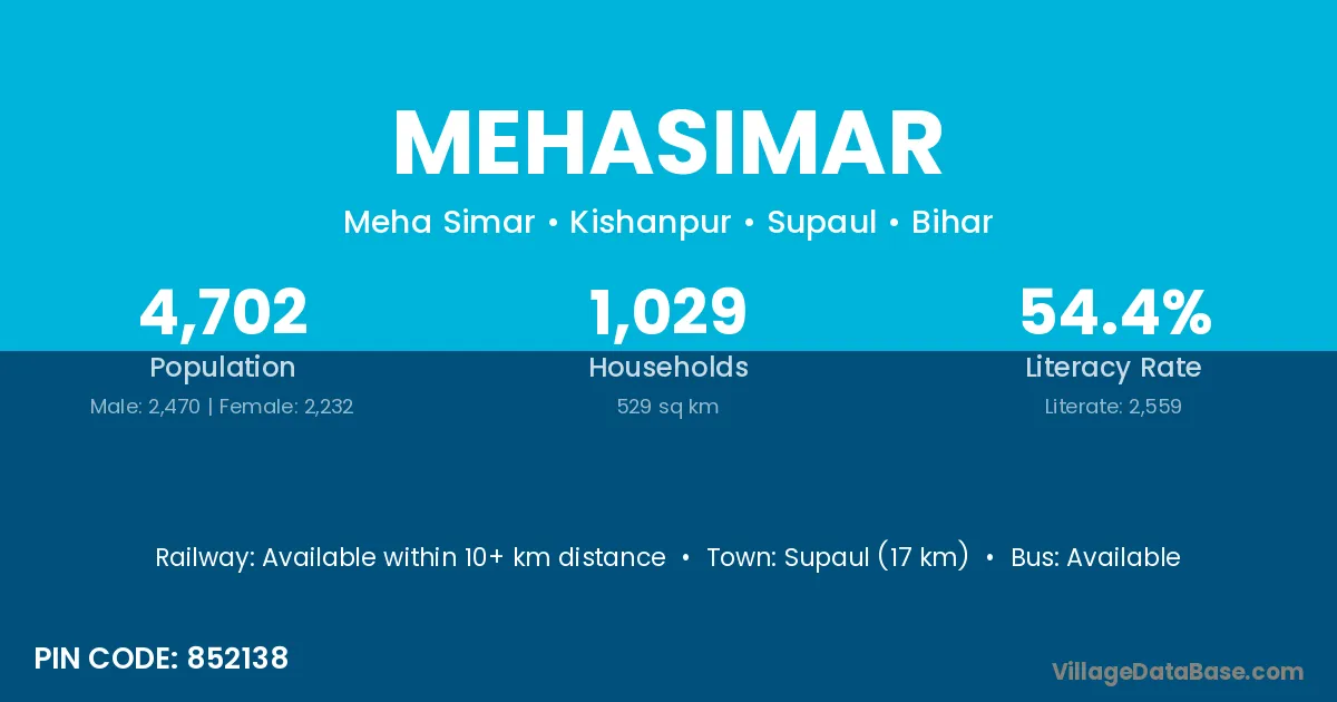 Supaul (17 km) is the nearest town to Mehasimar village for major economic activities and is located approximately 17 km away.