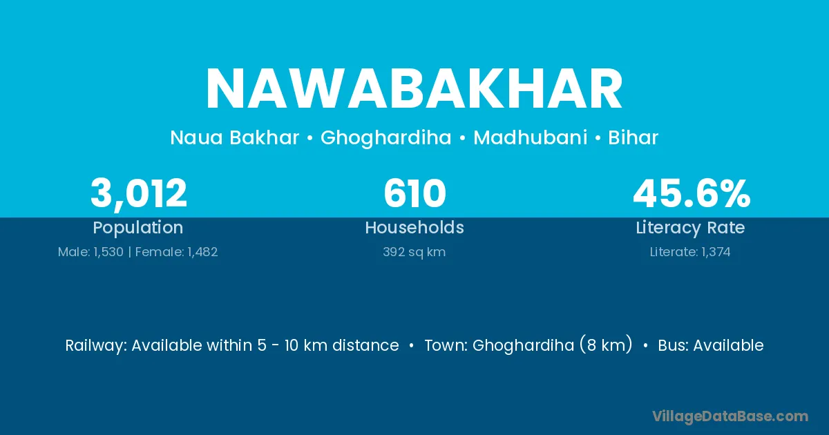 Supaul (13 km) is the nearest town to Nawabakhar village for major economic activities and is located approximately 13 km away.
