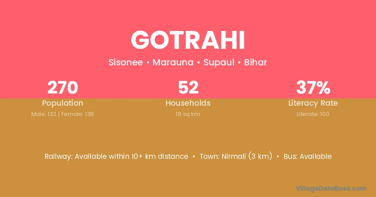 Nirmali (3 km) is the nearest town to Gotrahi village for major economic activities and is located approximately 3 km away.
