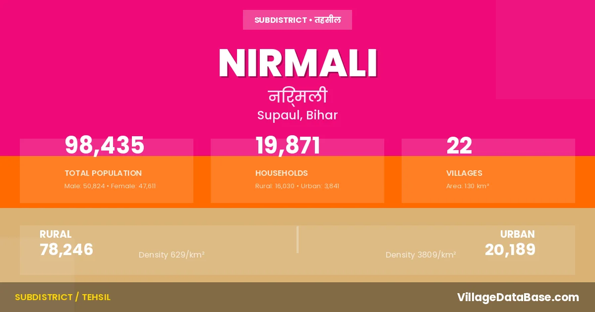 According to the 2011 census The total area of Nirmali Subdivision is 130 km², with a population of 98435 people. The population density is 758 inhabitants per square kilometre, and there are approximately 19871 houses in the sub district.