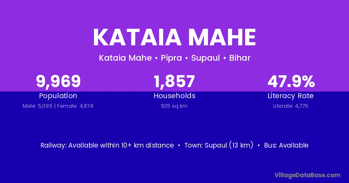 Supaul (13 km) is the nearest town to Kataia Mahe village for major economic activities and is located approximately 13 km away.
