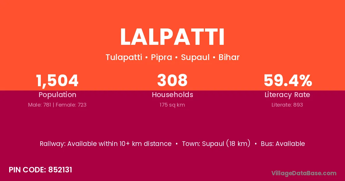Supaul (18 km) is the nearest town to Lalpatti village for major economic activities and is located approximately 18 km away.