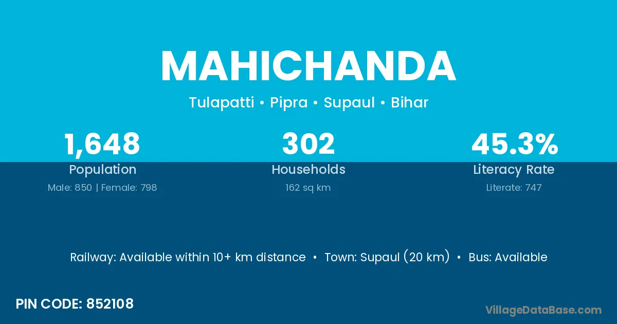 Supaul (20 km) is the nearest town to Mahichanda village for major economic activities and is located approximately 20 km away.