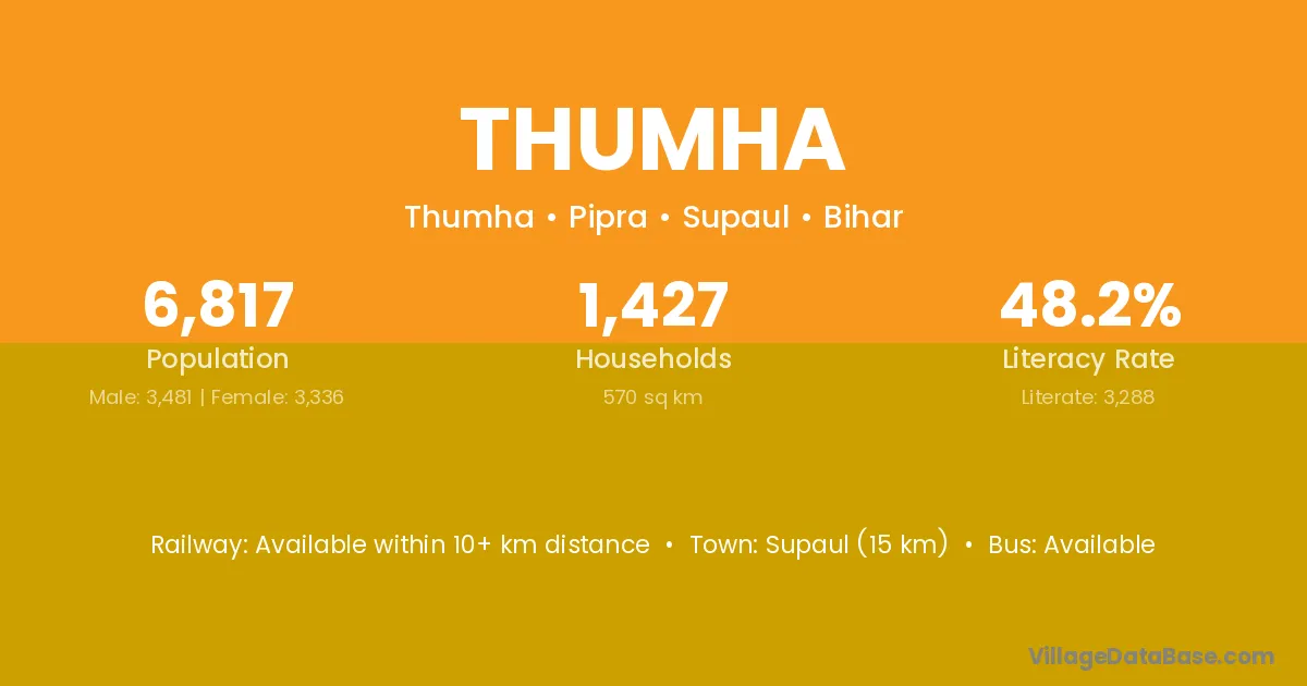 Supaul (15 km) is the nearest town to Thumha village for major economic activities and is located approximately 15 km away.