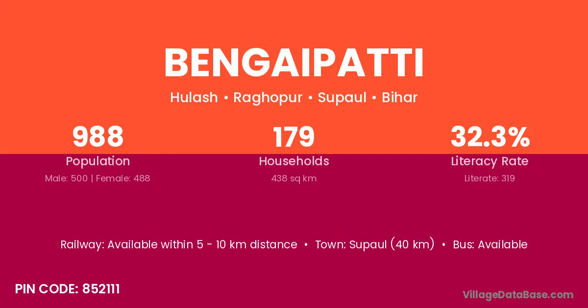 Supaul (40 km) is the nearest town to Bengaipatti village for major economic activities and is located approximately 40 km away.