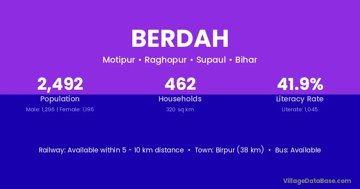 Birpur (38 km) is the nearest town to Berdah village for major economic activities and is located approximately 38 km away.