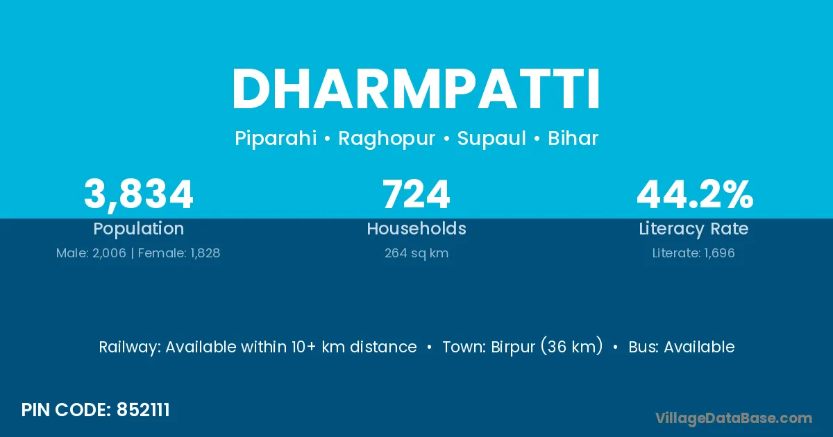 Birpur (36 km) is the nearest town to Dharmpatti village for major economic activities and is located approximately 36 km away.
