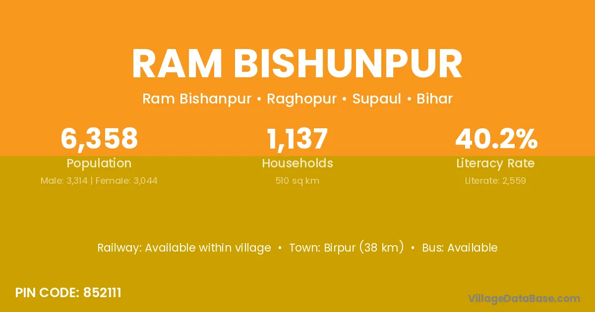 Ram Bishunpur village has a total population of 6,358 people, of which 3,314 are males and 3,044 are females.