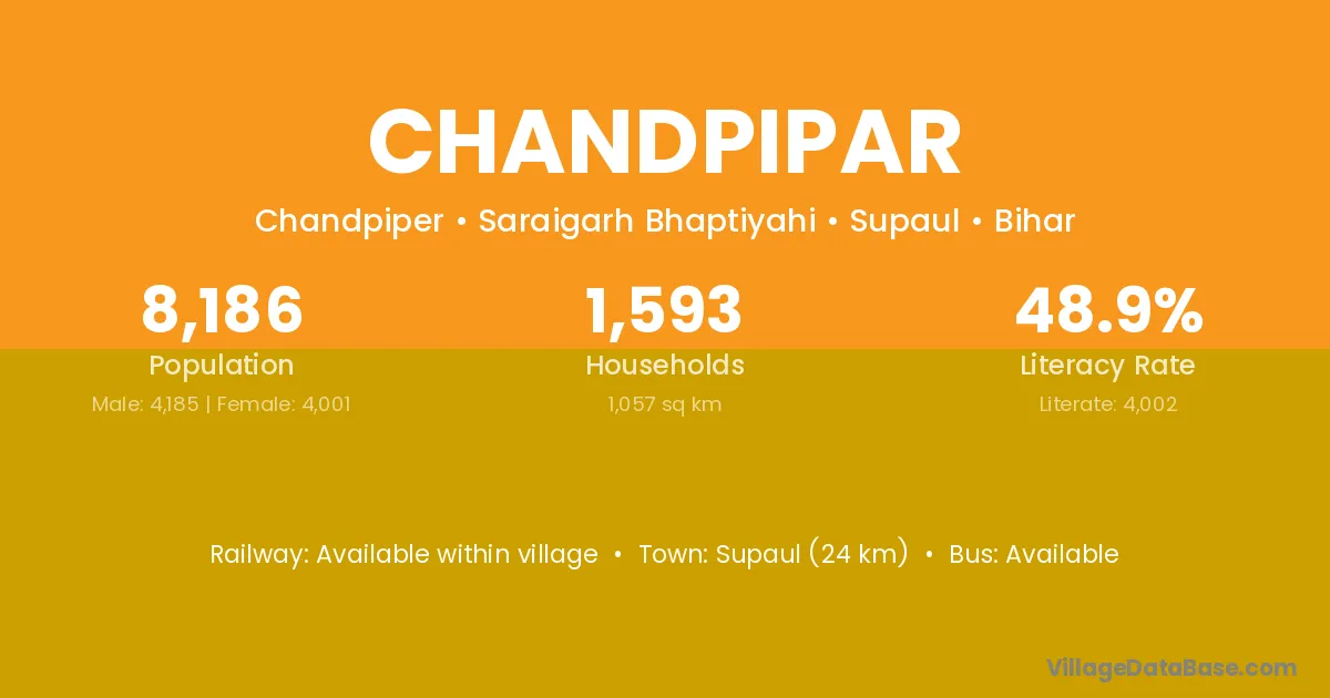 Supaul (24 km) is the nearest town to Chandpipar village for major economic activities and is located approximately 24 km away.
