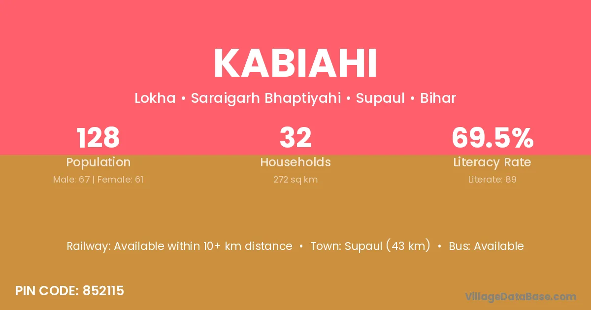 Supaul (43 km) is the nearest town to Kabiahi village for major economic activities and is located approximately 43 km away.