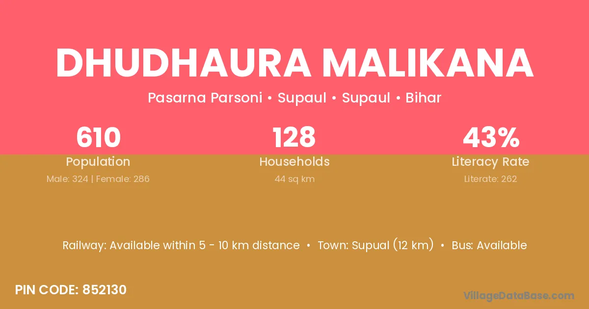 Supual (12 km) is the nearest town to Dhudhaura Malikana village for major economic activities and is located approximately 12 km away.