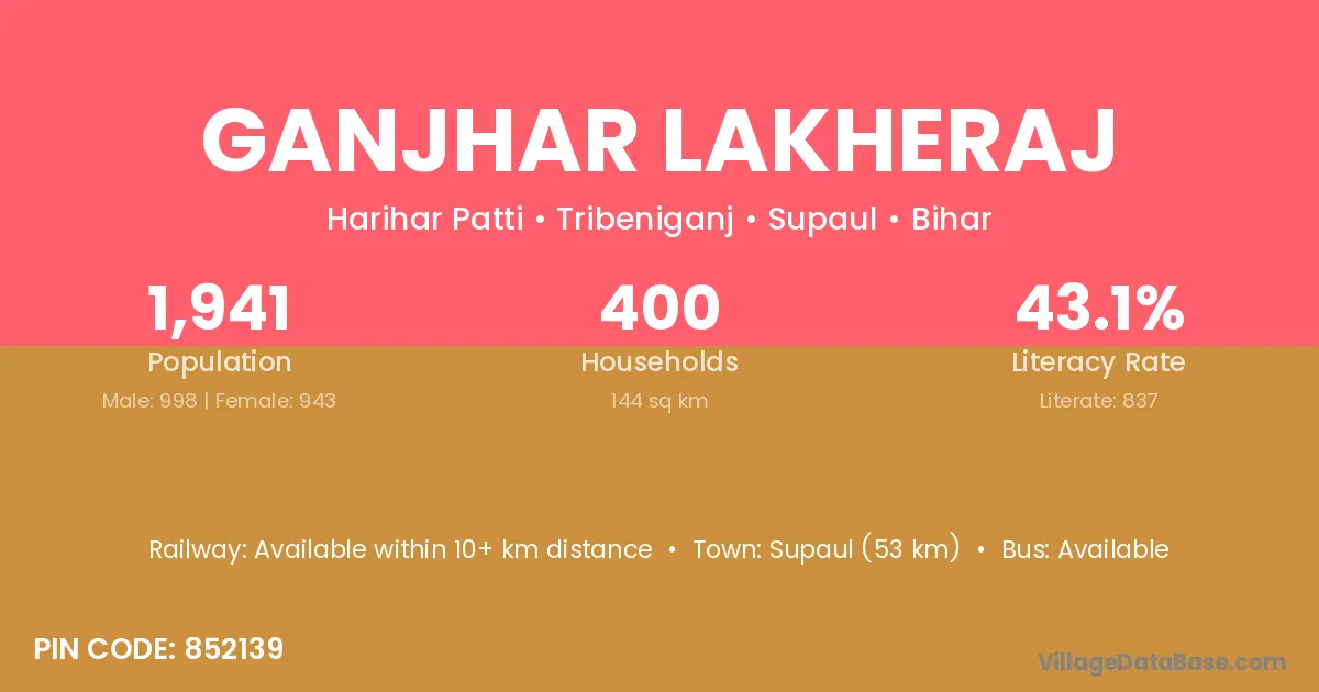 Ganjhar Lakheraj village has a total population of 1,941 people, of which 998 are males and 943 are females.