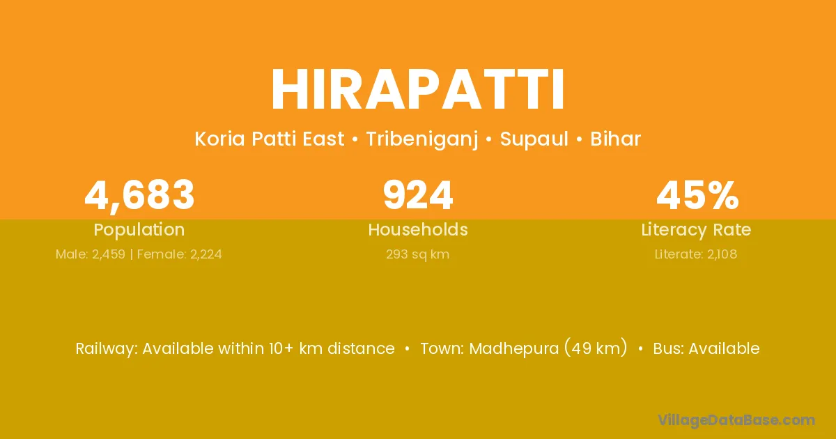 Madhepura (49 km) is the nearest town to Hirapatti village for major economic activities and is located approximately 49 km away.