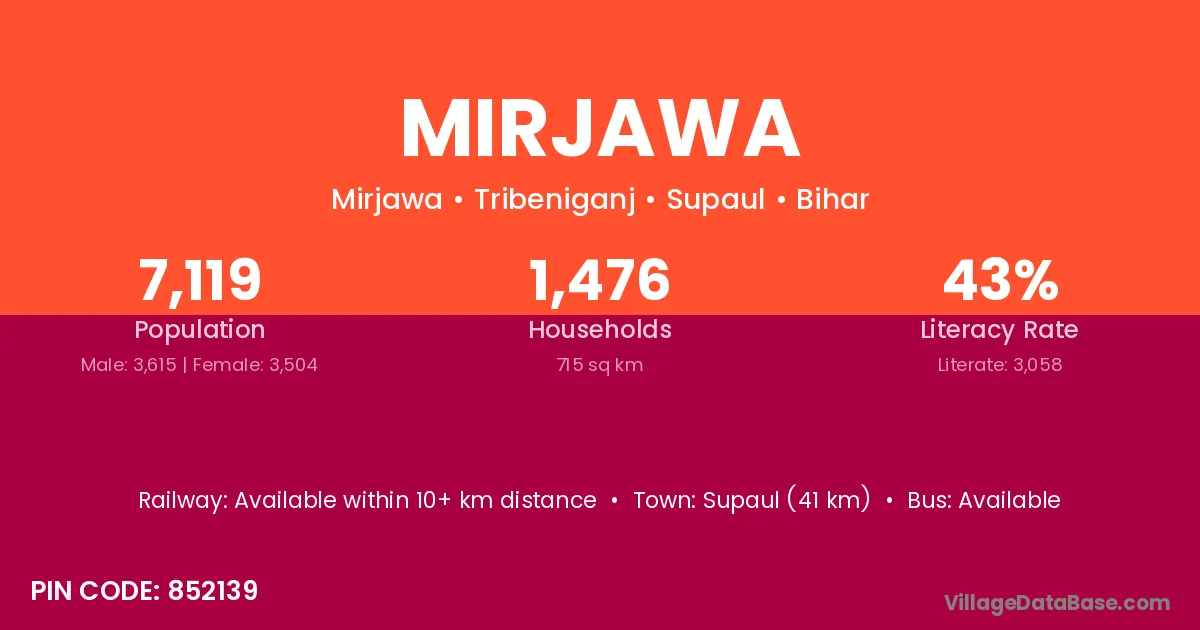 Supaul (41 km) is the nearest town to Mirjawa village for major economic activities and is located approximately 41 km away.
