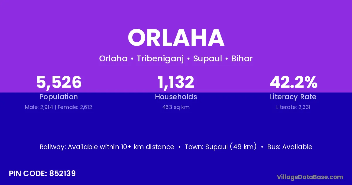 Supaul (49 km) is the nearest town to Orlaha village for major economic activities and is located approximately 49 km away.