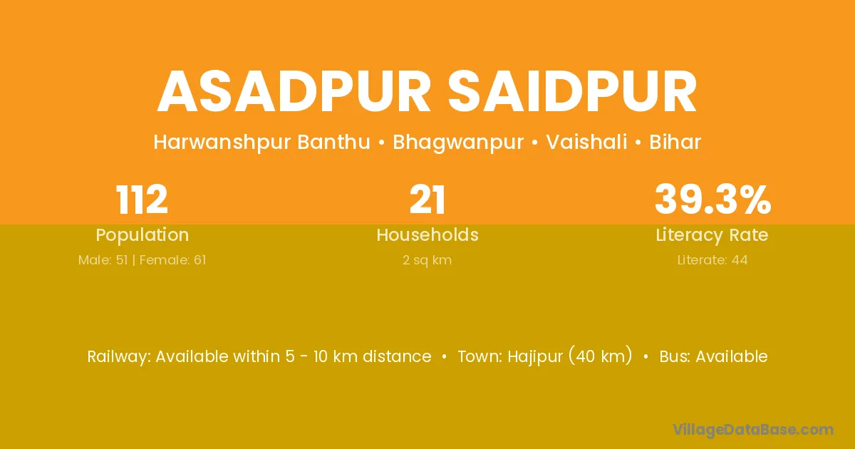 Hajipur (40 km) is the nearest town to Asadpur Saidpur village for major economic activities and is located approximately 40 km away.