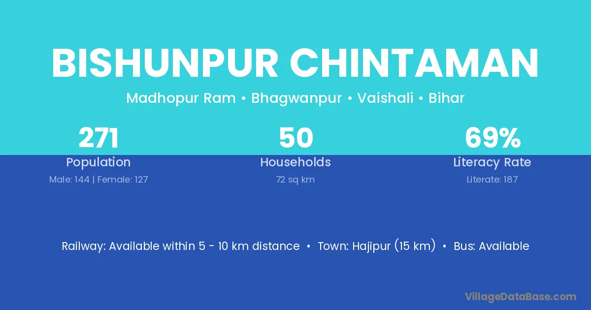 Hajipur (15 km) is the nearest town to Bishunpur Chintaman village for major economic activities and is located approximately 15 km away.
