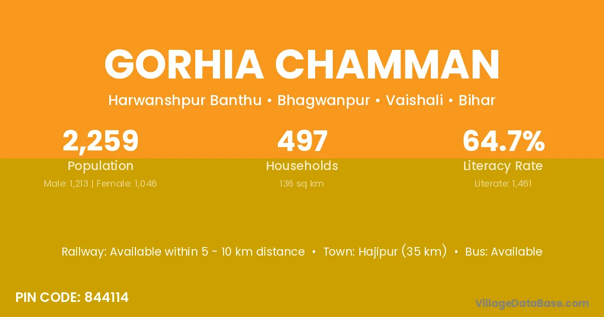 Hajipur (35 km) is the nearest town to Gorhia Chamman village for major economic activities and is located approximately 35 km away.