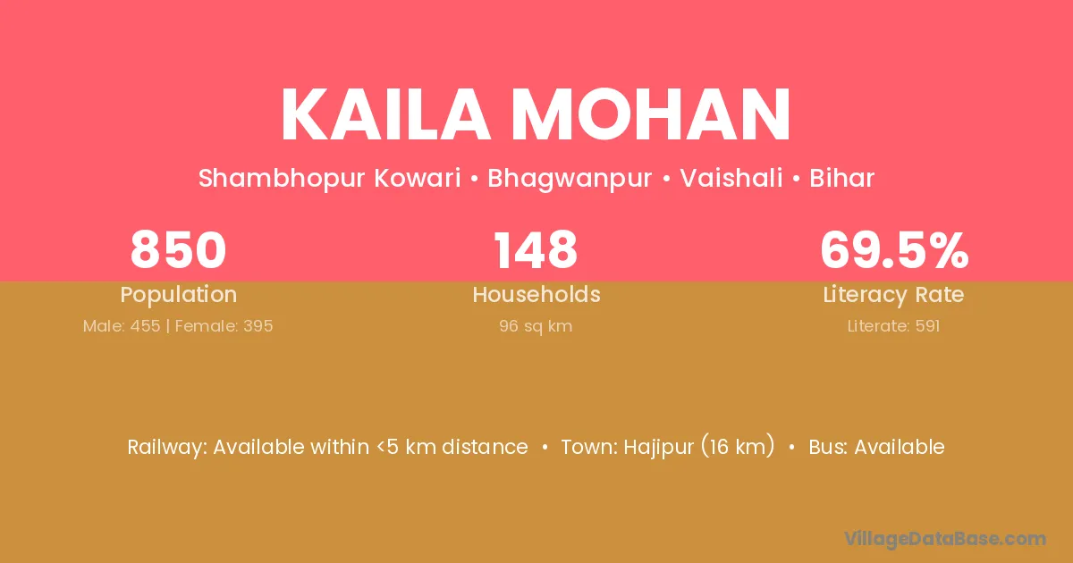 Hajipur (16 km) is the nearest town to Kaila Mohan village for major economic activities and is located approximately 16 km away.