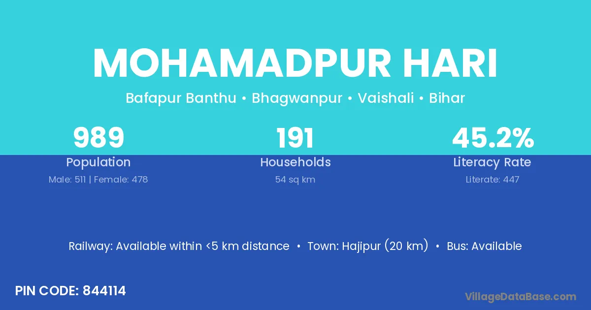Mohamadpur Hari village has a total population of 989 people, of which 511 are males and 478 are females.