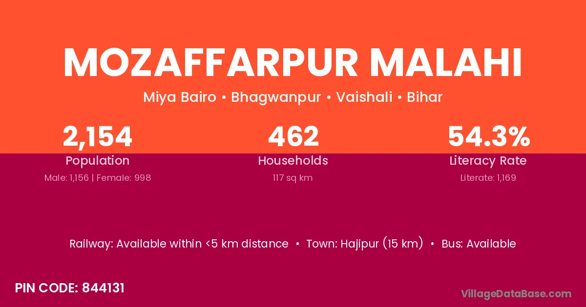 Hajipur (15 km) is the nearest town to Mozaffarpur Malahi village for major economic activities and is located approximately 15 km away.