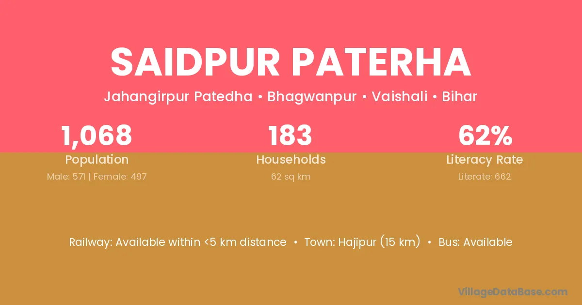 Hajipur (15 km) is the nearest town to Saidpur Paterha village for major economic activities and is located approximately 15 km away.