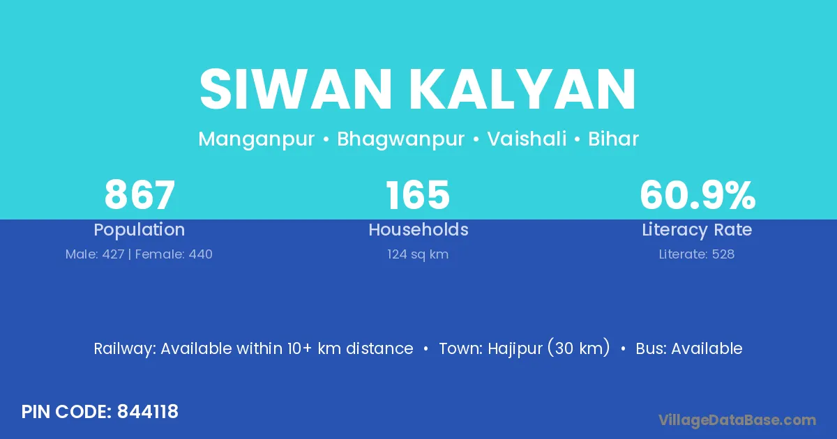 Hajipur (30 km) is the nearest town to Siwan Kalyan village for major economic activities and is located approximately 30 km away.