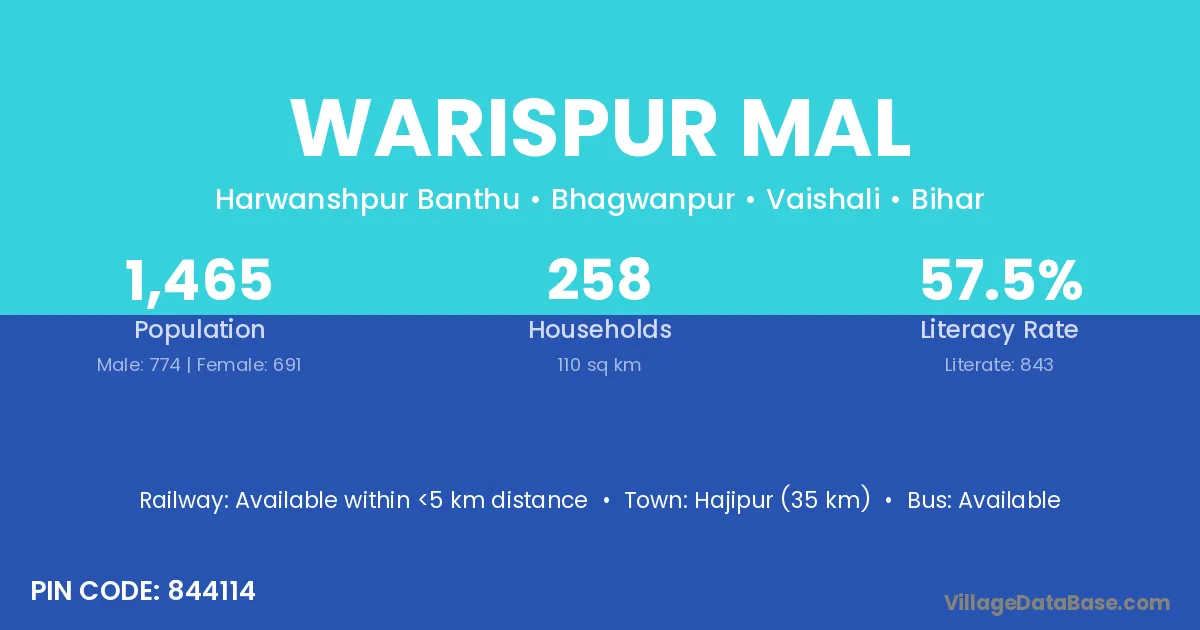 Hajipur (35 km) is the nearest town to Warispur Mal village for major economic activities and is located approximately 35 km away.