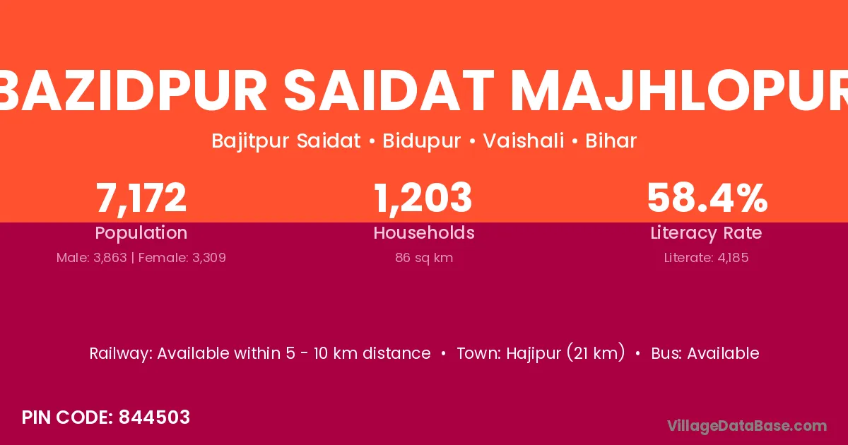 Hajipur (21 km) is the nearest town to Bazidpur Saidat Majhlopur village for major economic activities and is located approximately 21 km away.