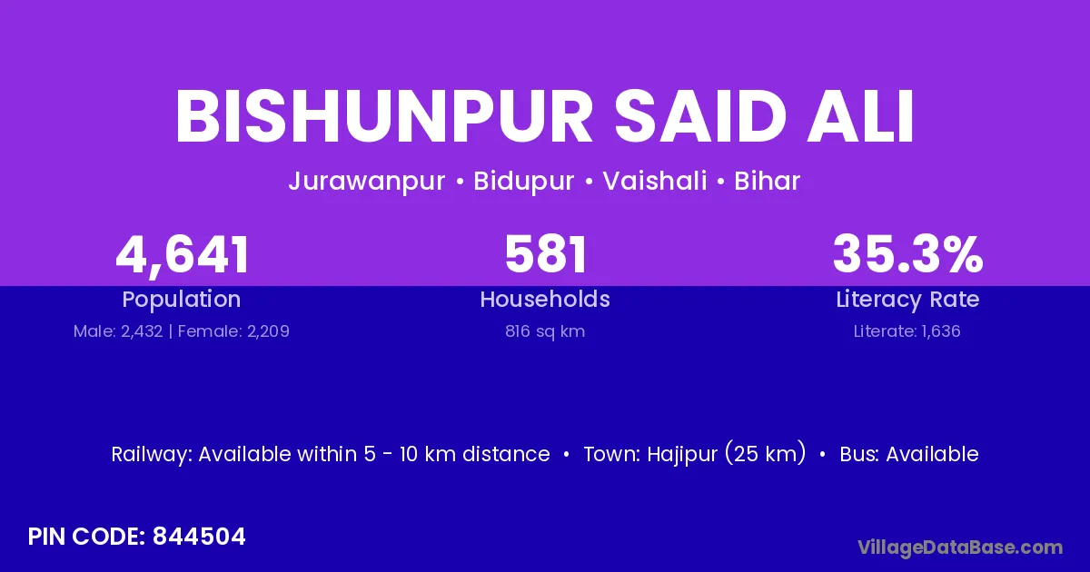 Hajipur (25 km) is the nearest town to Bishunpur Said Ali village for major economic activities and is located approximately 25 km away.