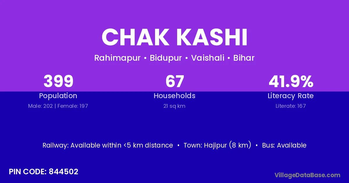 Hajipur (8 km) is the nearest town to Chak Kashi village for major economic activities and is located approximately 8 km away.