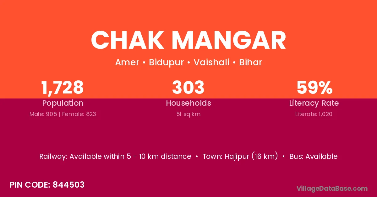 Hajipur (16 km) is the nearest town to Chak Mangar village for major economic activities and is located approximately 16 km away.